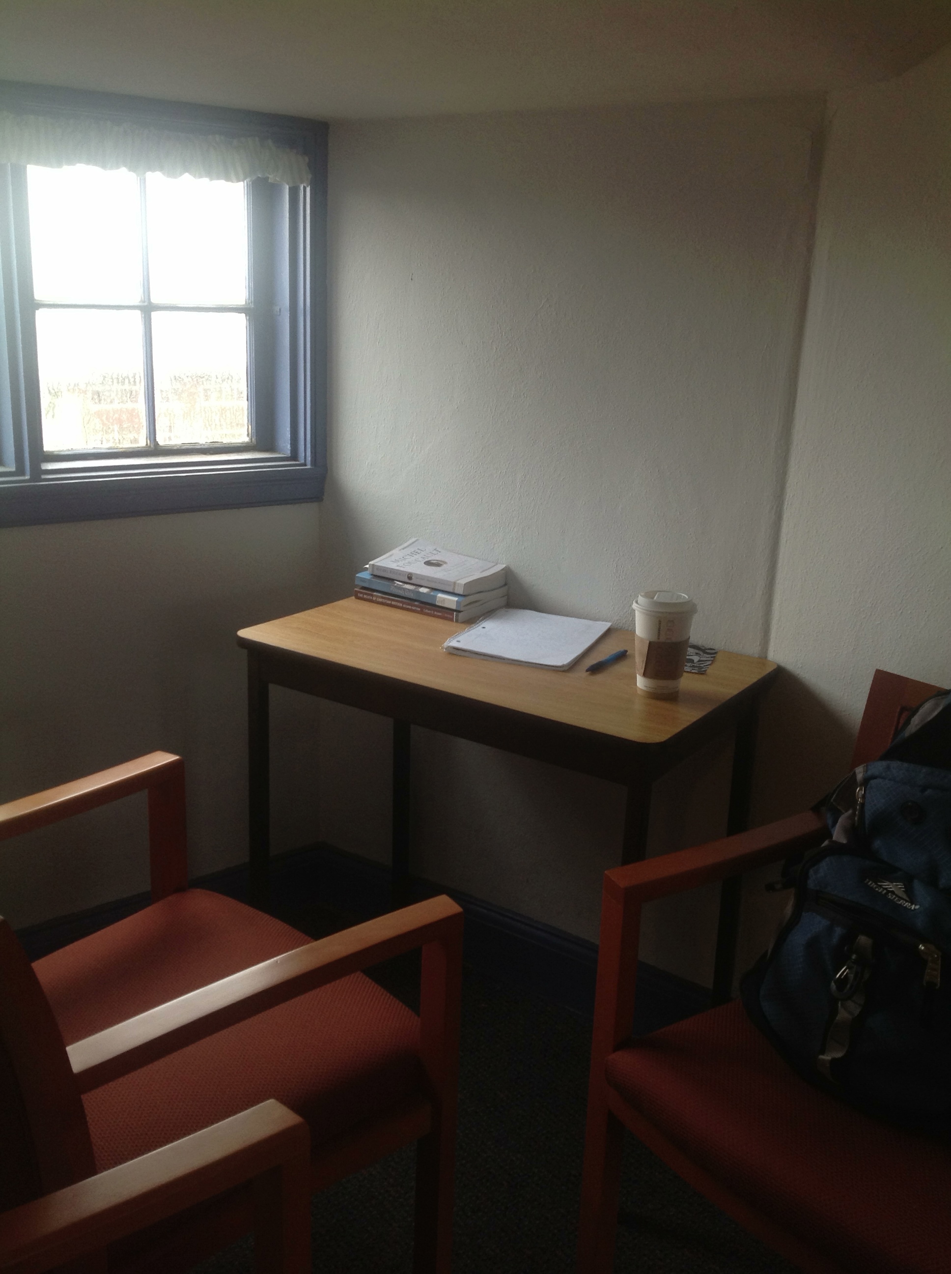 Although I would have preferred official office space — and often peeked wistfully into the open office doors of the Writing & Rhetoric faculty around me (bookshelves! desks! tables!) — I slowly learned to love this charming alcove. Indeed, I spent several Monday and Friday afternoons lounging with a student or two, discussing their work in my class, their research interests, and their uncertainties about the future… I do think I’ll miss it, and I do hope I get to see a few of them again.