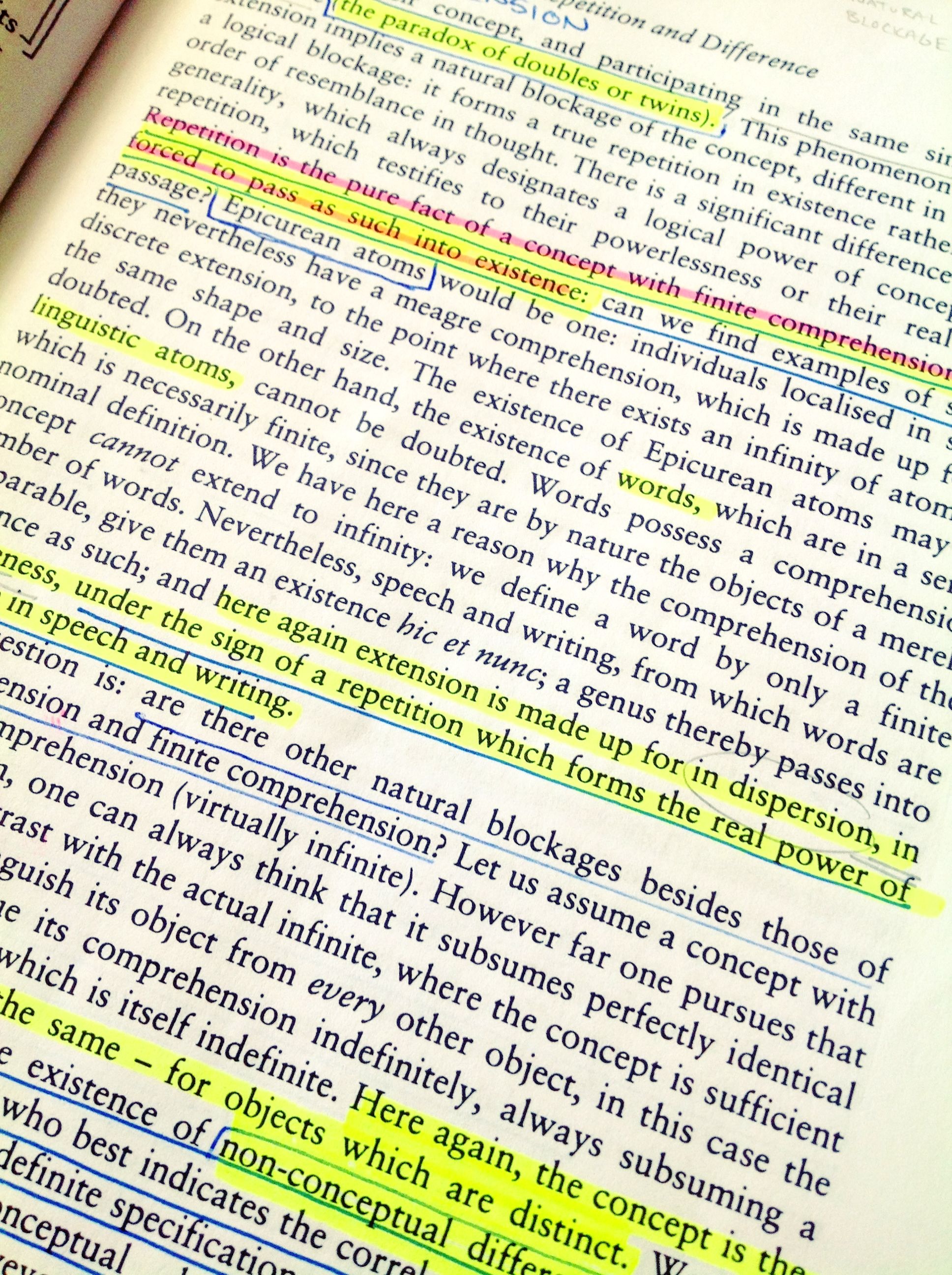 Deleuze’s sentences nearly become impenetrable in this section; indeed, I’ve spent several days (longer than I intended) avoidingย Difference and Repetition. Every time I wouldย sit down to work on this “Slow Reading” post, I would sigh with frustration and move on to other, more “pressing” projects. To gain a foothold, I returned to the guides that have been supplementing my slow excursion through Deleuze’s introduction (and of which I’ve been fairly critical) and found James Williams’s explication pretty useful. Before getting to Williams, though, I think it’s worth quoting the first confusing bit of Deleuze at length: