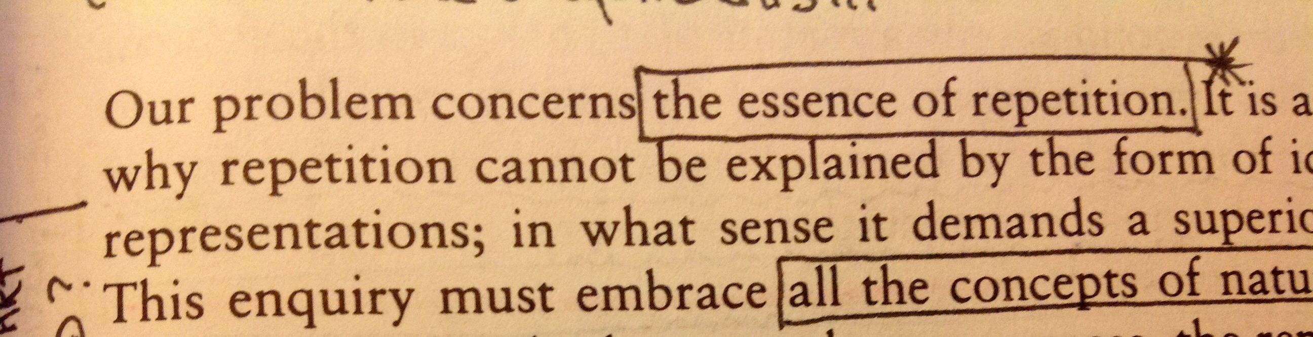 “Our problem,” Deleuze writes, “concerns the essence of repetition” (DR 19). I admit that I winced the first time I read this sentence some years ago, probably because “essence” has become a dirty word in literary and cultural studies. Indeed, critics and theorists in these fields have built up an allergy to talk of “essences” over the last four or five decades. To be accused of “essentialism,” after all, is to be accused of a destructive determinist mode of thinking. It is also to be accused of a trans- and thus anti-historicism. It is also to be accused of imposing a coercive, oppressive, or repressive category or concept (what is now commonly called a “social construct”) onto something or someone as if it were the natural truth of that something, someone, or someones. Though I tend to align myself with this “essentialism” allergy, I find that Gayatri Chakravorty Spivak offers a pretty important reminder: “essentialism is a loose-tongued phrase, not a philosophical school. It is used by nonphilosophers simply to mean all kinds of things when they don’t know what other word to use [. . .] [Deconstruction] teaches me something about essentialisms being among the conditions of the production of doing, being, but does not give me a clue to the real. The real in deconstruction is neither essentialist nor antiessentialist. It invites us to think through the counterintuitive position that there might be essences and there might not be essences” (Outside in the Teaching Machine 8, 11).
