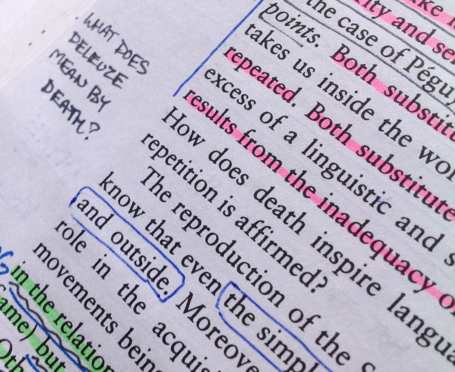 Both [Roussel and Péguy] substitute a vertical repetition of distinctive points, which takes us inside the words, for the horizontal repetition of ordinary words repeated. Both substitute a positive repetition, one which flows from the excess of a linguistic and stylistic Idea, for a repetition by default which results from the inadequacy of nominal concepts or verbal representation. How does death inspire language, given that it is always present when repetition is affirmed? (DR 22)