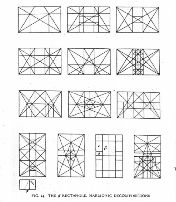 However, I have less interest explicating either the applications of the golden ratio or  Deleuze’s example, drawn from Ghyka, of “double squares” and pentagons or pentagrams than I am in his main point: namely, that immanent to symmetrical and repeatable figures like squares there is an irrational logic that can repeat itself in all sorts of wildly radiating ways. Check out these diagrams, which I’ve borrowed from two of Ghyka’s works. The first comes from The Geometry of Art and Life (1946):