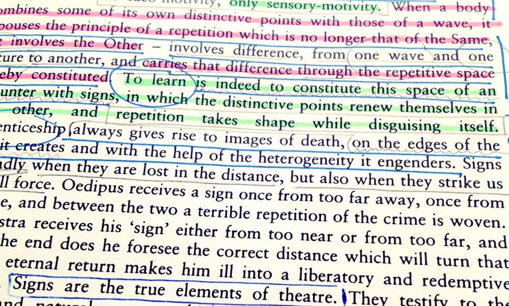 Representations, he argues, are false movements, representations like the written formulas my freshmen use, the recitations of “times tables,” the cold readings of the words in a script or a book of poetry. These students believe they can write; do math; read literature. But these beliefs, Deleuze would insist, are as false as the objects, words, and characters that circulate on the stage of a theatre. The real movements—in theatre as in the classroom as in a body of water—are signs. These signs are not simply words; they are forces that act upon us, forces that circulate within pressing ordeals. They have claws, charms, styles, and intensities. They allure, disgust, confuse, and teach. They call for responses, they envelop objects and subjects, they compose friendships, they shape destinies (of Oedipus, of Hamlet, of me, of you). Moreover, they put to death our “real worlds” and let slip the glimpse of a different world immanent to our false movements. This is a world of partials, roles, masks, and gestures—all of which are grounded in a universal but dynamic ungroundedness. The circulation of “a life” predicated upon an immanent “death.” That still doesn’t do it . . . but it gets at something that seems missing in most introductions to Difference and Repetition and even in the most recent treatments of this text.