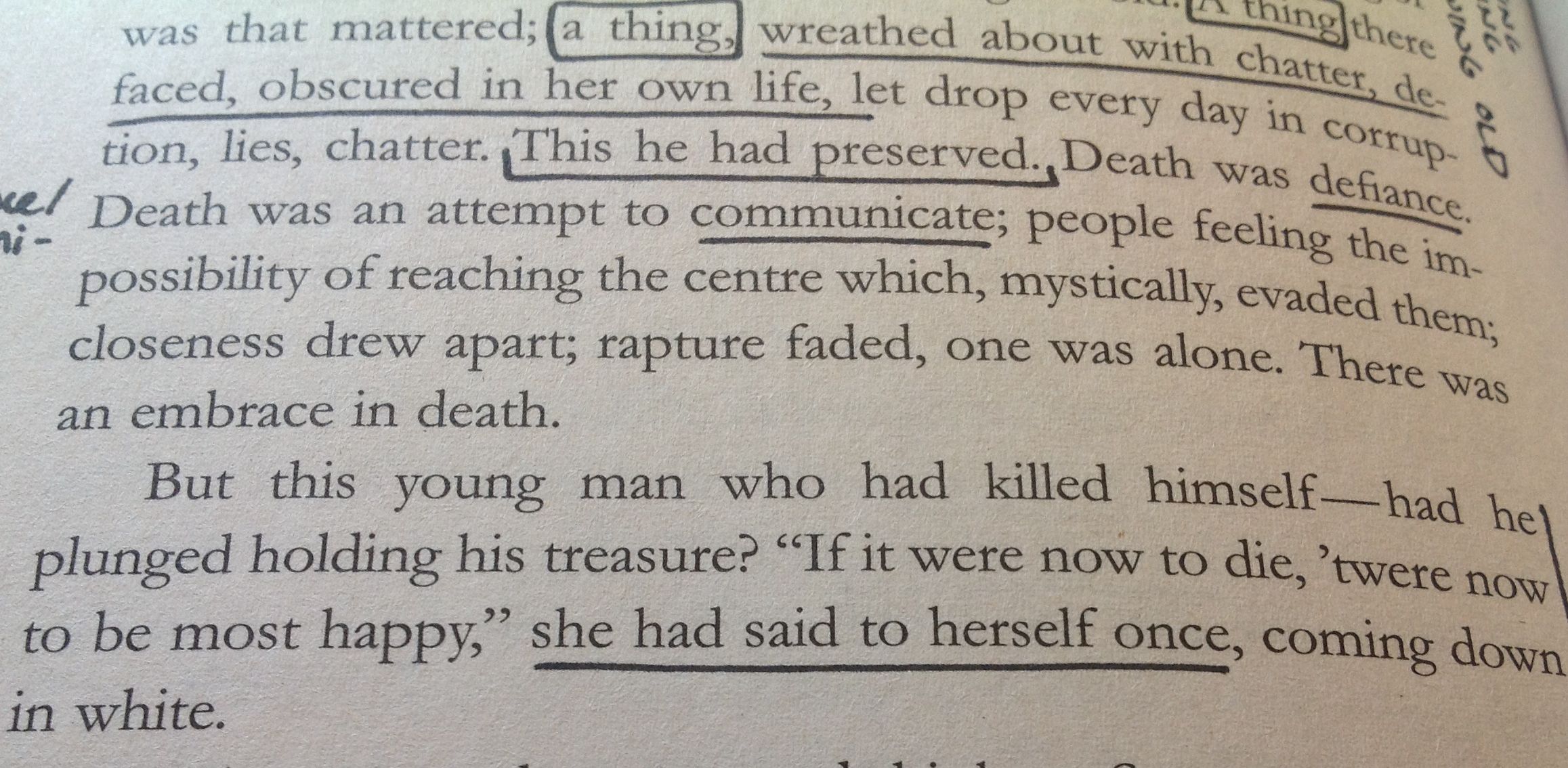 She had once thrown a shilling into the Serpentine, never anything more. But he had flung it away. They went on living (she would have to go back; the rooms were still crowded; people kept on coming). They (all day she had been thinking of Bourton, of Peter, of Sally), they would grow old. A thing there was that mattered; a thing, wreathed about with chatter, defaced, obscured in her own life, let drop every day in corruption, lies, chatter. This he had preserved. Death was defiance. Death was an attempt to communicate; people feeling the impossibility of reaching the centre which, mystically, evaded them; closeness drew apart; rapture faded, one was alone. There was an embrace in death.