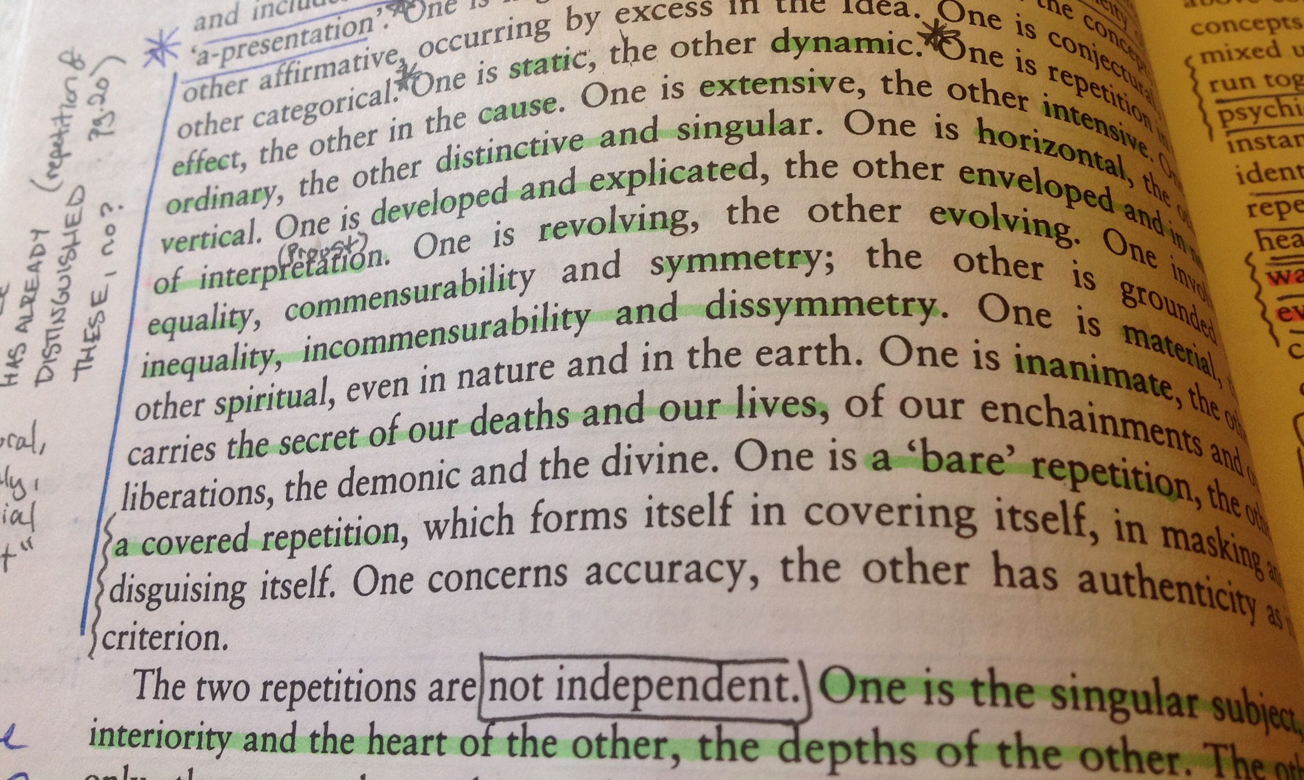 One [repetition] is extensive, the other intensive. Once is ordinary, the other distinctive and singular. One is horizontal, the other is vertical. One is developed and explicated, the other enveloped and in need of interpretation. One is resolving, the other evolving. One involves equality, commensurability and symmetry; the other is grounded in inequality, incommensurability and dissymmetry. One is material, the other spiritual, even in nature and in the earth. One is inanimate, the other carries the secret of our deaths and our lives, of our enchainments and our liberations, the demonic and the divine. One is a ‘bare’ repetition, the other a covered repetition, which forms itself in covering itself, in masking and disguising itself. One concerns accuracy, the other authenticity as its criterion. (DR 24)