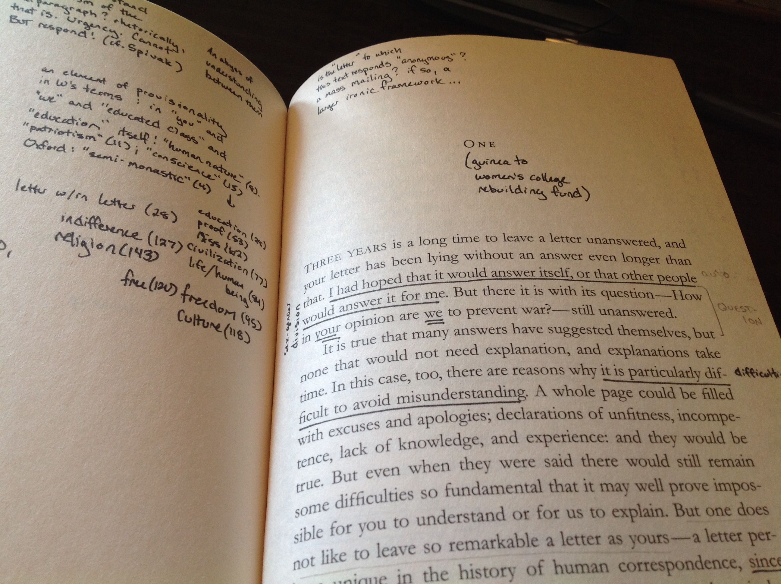 Woolf’s opening paragraph: “Three years is a long time to leave a letter unanswered, and your letter has been lying without an answer even longer than that. I had hoped that it would answer itself, or that other people would answer it for me. But there it is with its question—How in your opinion are we to prevent war?—still unanswered” (5). I want to begin this Slow Reading project with three observations.