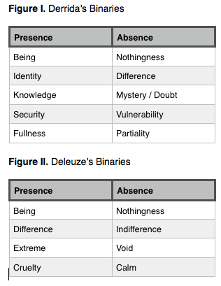 For a literature student who has been steeped in Derrida’s argument, as I have, Deleuze’s references to “essence” and “presence”—especially in Proust and Signs and Difference and Repetition—can seem somewhat naive or antiquated. However, after reading Deleuze, it is often Derrida who can seem naive. For him, difference must remain in opposition to identity; (self-)identity is still the point of departure from which he asserts the movement of the trace, the inescapable operation of differance, and (of course) “the structural necessity of the abyss.” For Deleuze, however, the primary relation is not between identity and the abyss. It is still, of course, between presence and absence or being and nothingness (as the tables above show), but these terms are now aligned, respectively, with difference and indifference. Difference is and is the only thing that truly is, but it is only in relation to its ground: indifference, nothingness, the abyss, the calm surface.