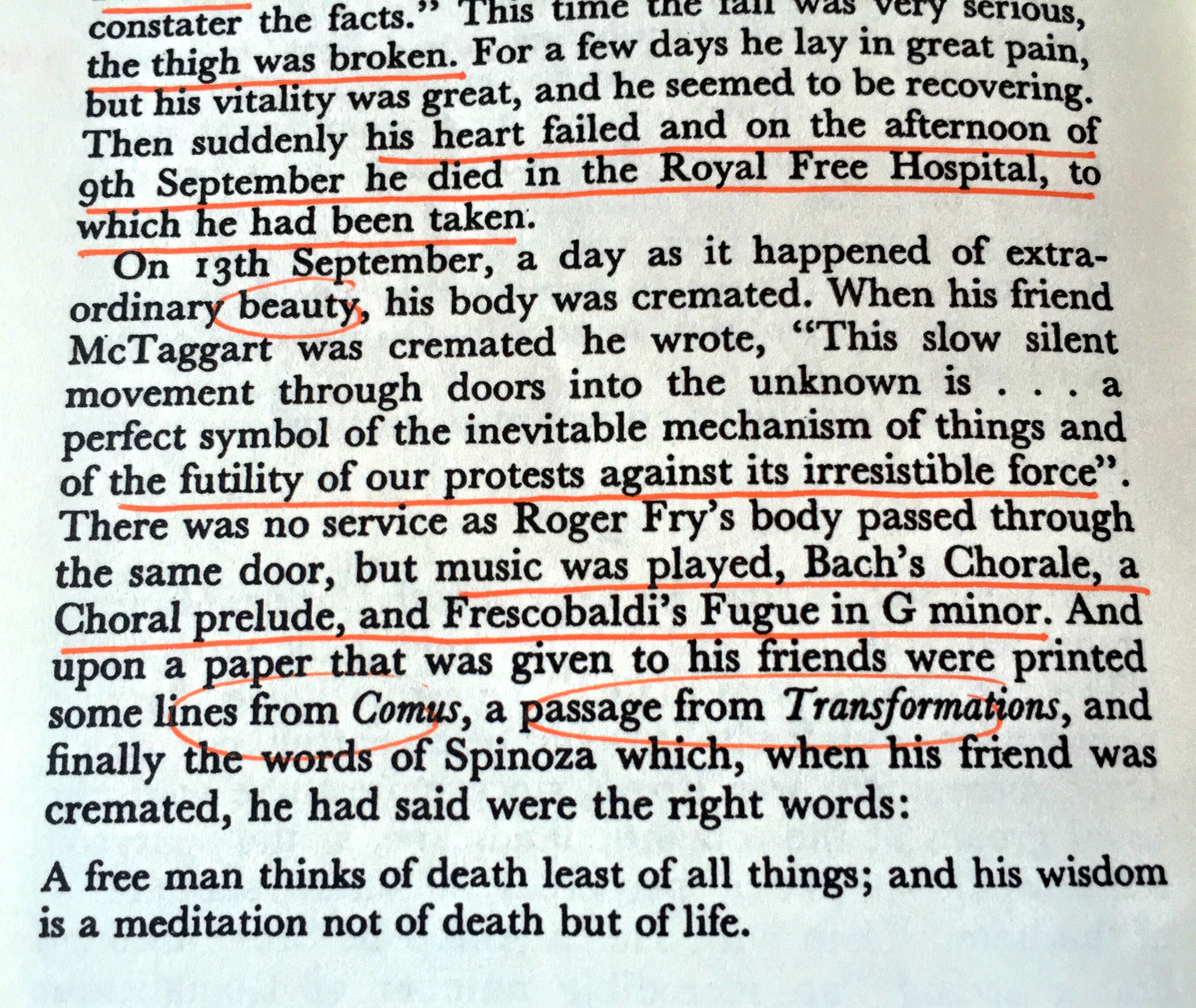 I admit that I am delighted not just by how quotable Fry is. (His words about meeting André Gide continue to stay with me all these months later: “He’s a real event in my life at a time when events are very rare. [. . .] He’s almost too ridiculously my counterpart in taste and feeling. It’s like finding a twin” [211].) I am more delighted by the capacity of Woolf to make such quotations resonate, giving them relationships to other moments or movements or crises (in thought, feeling, occupation). Whether it’s the slow break from his parents’ vision of his career in science, his abandonment of religious faith, his time in the United States, his everyday life during the war, his failure in attaining a university position, his success as a touring lecturer, or his musings on aging and writing . . . regardless of whatever Fry is so eloquent in describing or analyzing, Woolf is equally impressive in her role as commentator, summarizer, and occasional speculator.