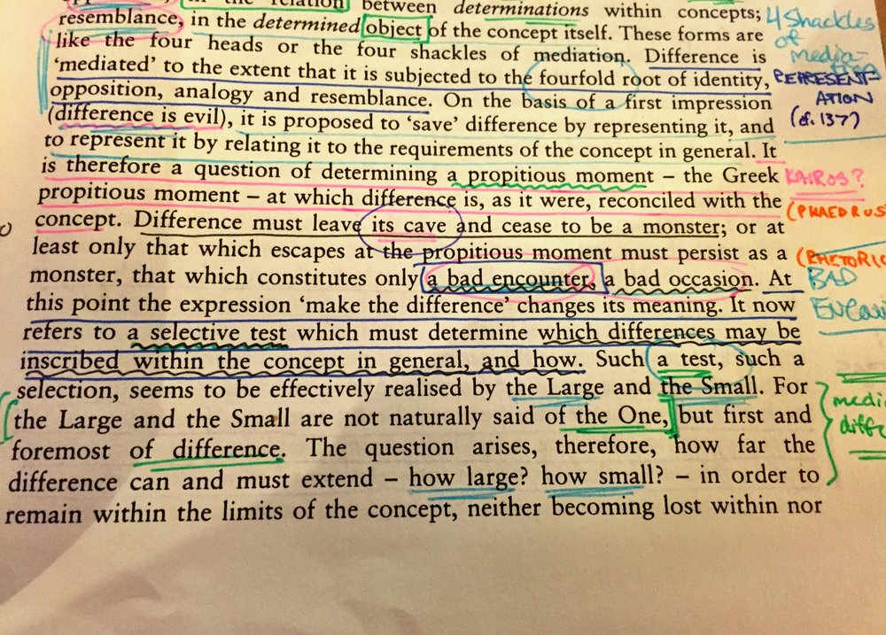 The opening paragraphs of DR offer a brief “In the beginning…” story. In the beginning was difference in itself emerging wherever determinations (things we recognize) combined with elements of the indeterminate. Such combinations felt like errors, monsters, and cruelties. In the beginning (simultaneously) was philosophy engaging with these combinations, shackling them in the prison house of Representation and with the chains of Identity, Analogy, Opposition, and Resemblance. Deleuze’s closing questions, it seems to me, collectively ask: could it have been otherwise? Can it be otherwise here and now? Can one imagine different tests, other methods of selection, other understandings of moments or encounters in order to understand or even to make difference in itself? To approach the One without reducing it to mediations among or between? To work his way toward a “Yes!”—one that he will repeat throughout his life and work—Deleuze must move on from his obscure prefacing—which has tripped me up for months—and engage directly with the history of thought that precedes him in order to carve out his own combination of determinations and the indeterminate and to free his own monsters from their caves.