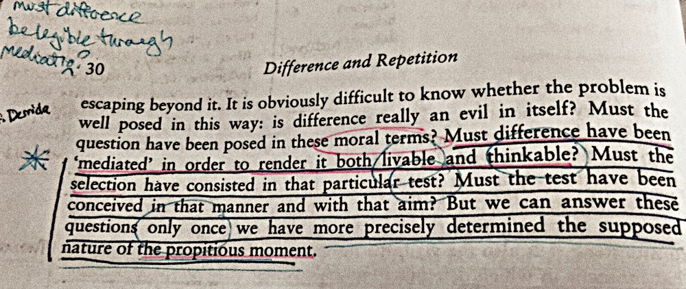 It is obviously difficult to know whether the problem is well posed in this way: is difference really an evil in itself? Must the question have been posed in these moral terms? Must difference have been ‘mediated’ in order to render it both livable and thinkable? Must the selection have consisted in that particular test? Must the test have been conceived in that manner and with that aim? But we can answer these questions only once we have more precisely determined the supposed nature of the propitious moment. (DR 30)