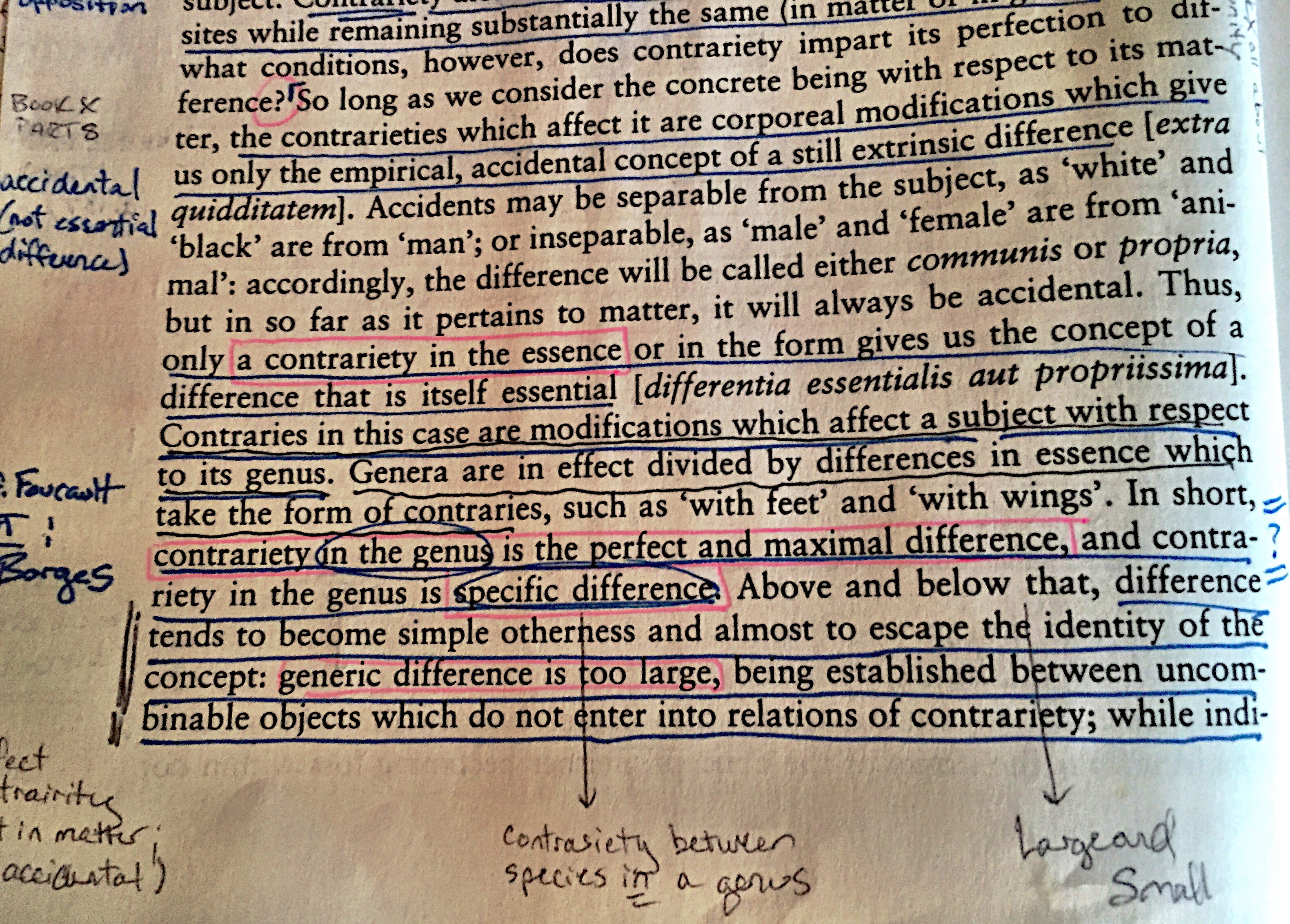 The next two paragraphs may seem a bit strange to regular readers of Deleuze, since it is rare for him to spend so much time summarizing the writings of philosophers and even stranger for him to be spending time on Aristotle. Even his monographs on Nietzsche, Leibniz, and others tend more toward idiosyncratic synthesis or collage—where it is difficult to demarcate, as Roland Barthes puts it, “Who is speaking thus?”—rather than summary or analysis. At the very least, these pages on Aristotle evince the fact that DR is part of Deleuze’s doctoral project, the outcome, that is, of decades of research, study, and intellectual development that one can track through his previous books and essays on Hume, Kant, Proust, Bergson, Nietzsche, Sacher-Masoch, and others. As a doctoral thesis, then, DR must portray (as all such documents “must”) the scholarly credentials of the one composing it. What better way to establish these credentials than to include a section that directly addresses Aristotle’s writings on difference? (We will encounter something similar in the section on Martin Heidegger later in the chapter [pp. 64-66]. I’ll get to those pages in about fifteen years…)