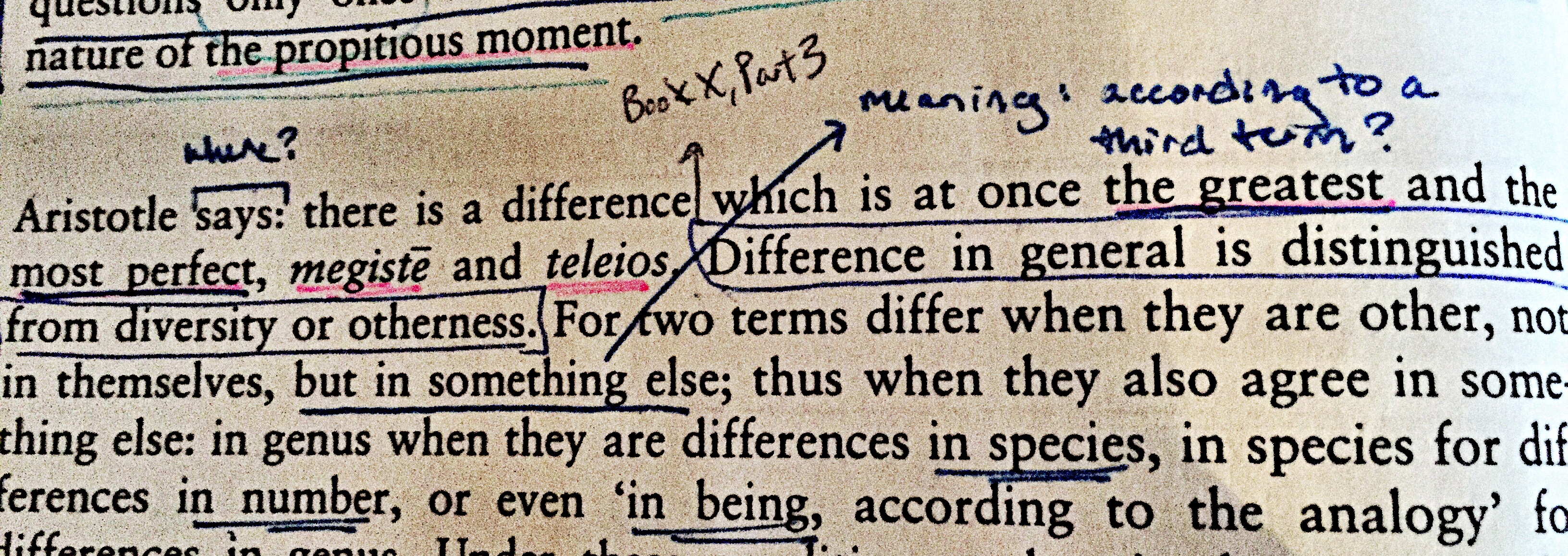 I’ve already indicated that this is a scholarly section of DR, but one might still ask, “Why is Deleuze rehearsing Aristotle, specifically?” Perhaps because—in a pertinent section of The Metaphyics devoted to the problem of oneness or unity—Aristotle identifies and defines “a greatest” or maximal “difference” (Bk X, Pt 4). If Aristotle has already developed a concept of difference and if he has done so from a starting point of mediation (“difference [. . .] must be between two things” [1055a]), then there is no point to move on with Deleuze’s chapter, is there? If Aristotle can construct a robust notion of “Difference in Itself” as a matter that must concern two things—rather than a matter of singularities, as Deleuze has already insisted—then perhaps I’m wasting and have wasted my time with this slow reading.