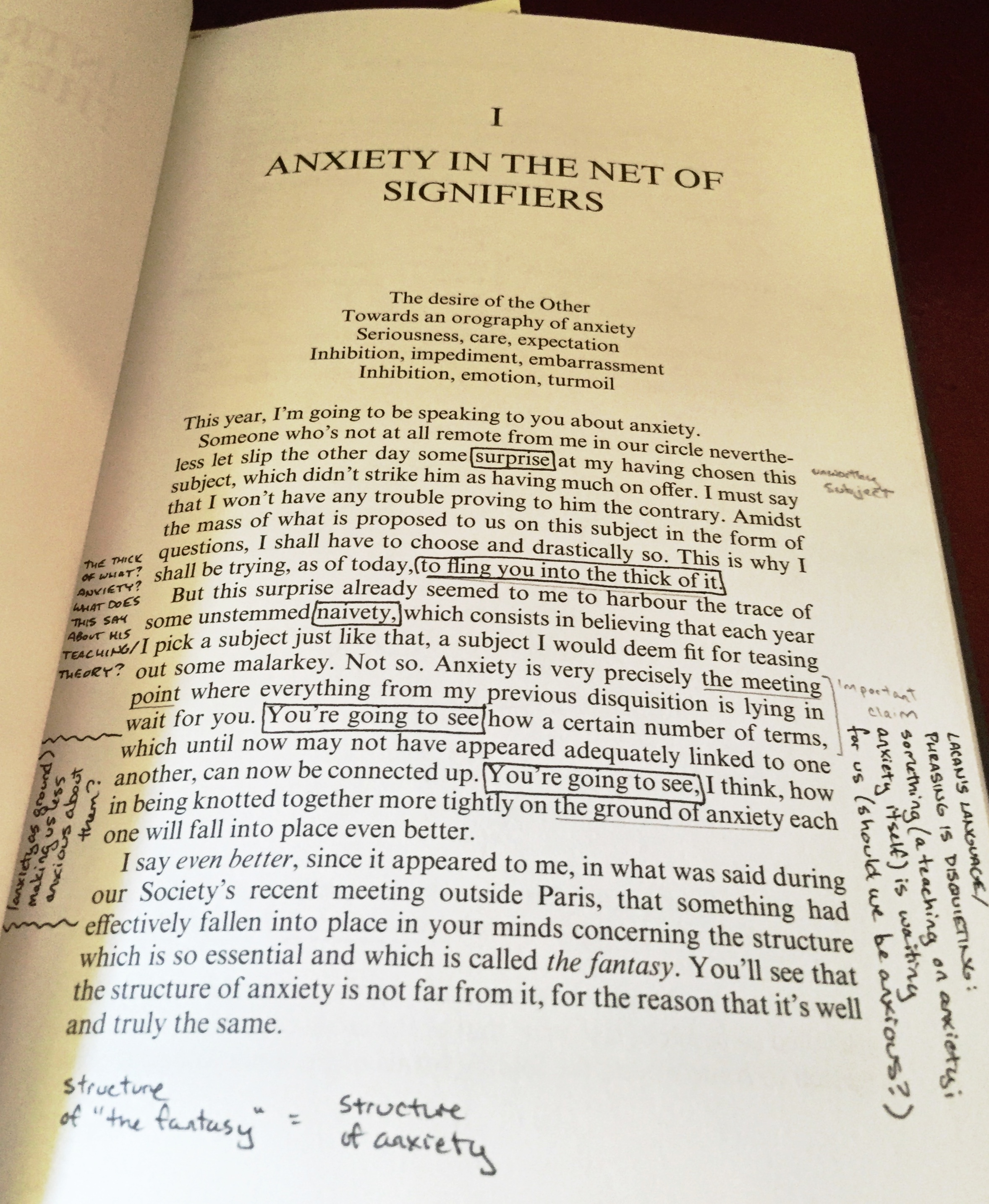 A student recently asked me if I would be willing to work with him on a one-credit directed study of Jacques Lacan’s Anxiety seminar. Though I was and am happy to consent, I have to confess that the idea of reading/teaching Lacan has always given me anxiety. This is not because I shy away from difficult texts. I’ve assigned snippets of Hegel, paired love novels with Roland Barthes’s A Lover’s Discourse, introduced non-philosophy students to Kant’s three Critiques, and even put Of Grammatology on an undergraduate reading list (see the playlist of my supplementary lectures here).
