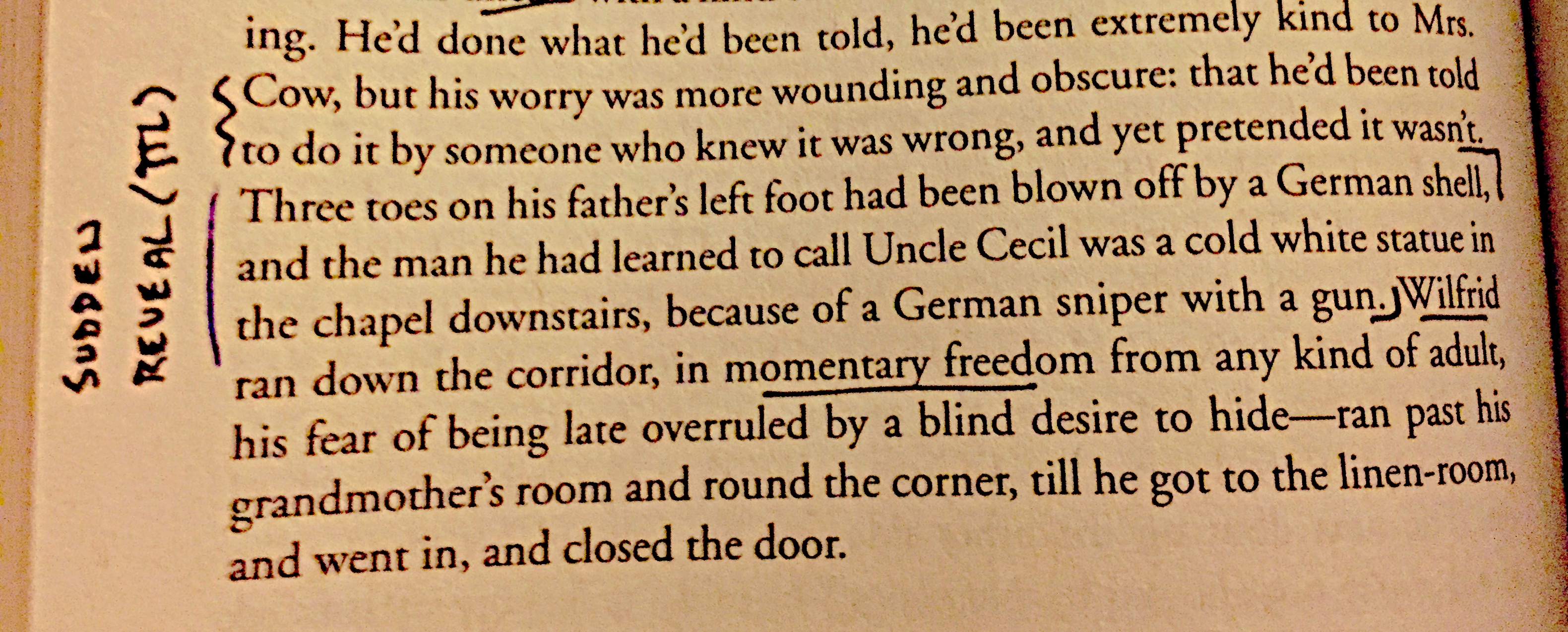 Three toes of his father’s left foot had been blown off by a German shell, and the man he had learned to call Uncle Cecil was a cold white statue in the chapel downstairs, because of a German sniper with a gun. (94)