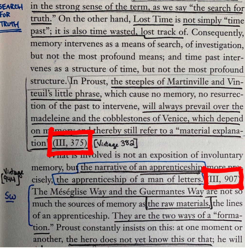 [EDIT (18 April 2020): Looking back at the copyright page for Howard’s translation of Proust and Signs, I see that the English translation is quite a bit older than I thought it was when first composing this piece yesterday. The Regents of the U of Minnesota took over the copyright of Proust and Signs in 2000, but the translation was first published in 1972. I’m sure the 3-volume edition A la recherche that Deleuze used was still widely used at this time.]