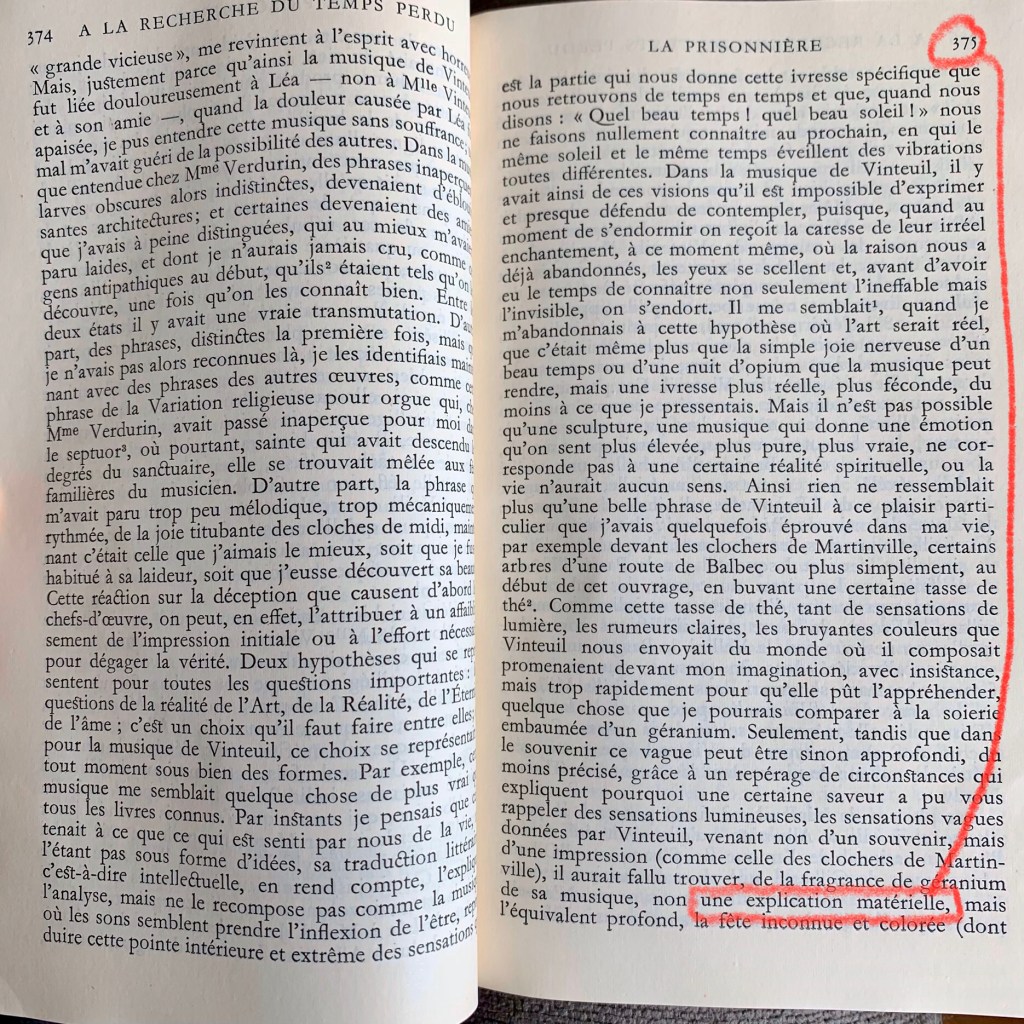 Recently, I located the correct Proust edition in the University of South Dakota’s library, and the library staff were kind enough to ship them to my home. Here’s where “material explanation” (see image above) appears on the 375th page of v. III of the French edition as “explication matérielle.”