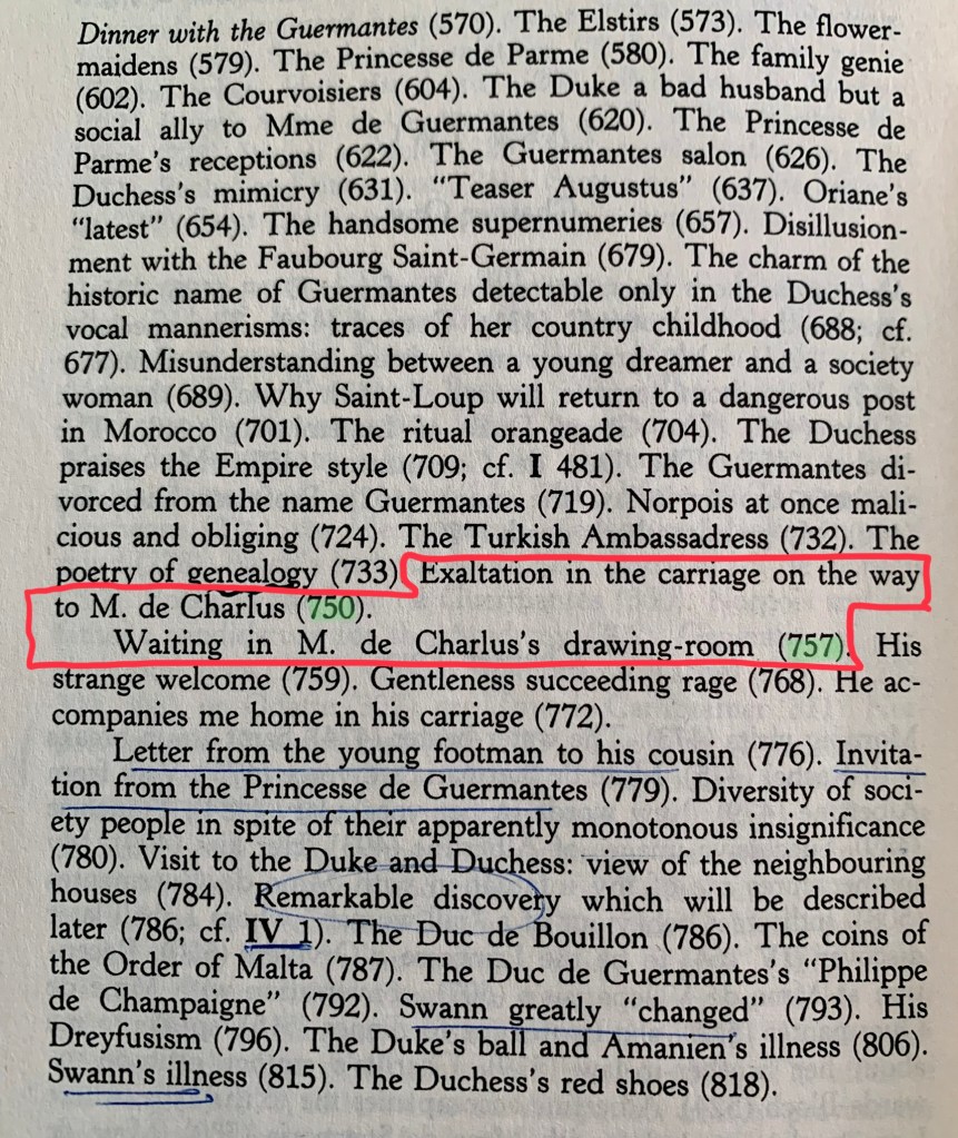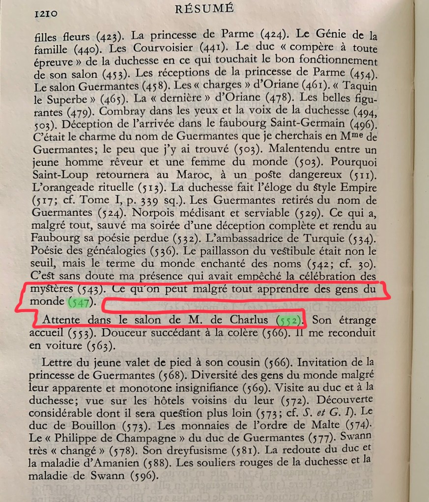 The original citation in Proust et les signes (“CG3, II, 547–552”) clarifies that the intended passage or scene appears in the third section/volume of La côté de Guermantes (“CG3”). But we don’t have that information in Proust and Signs. The citation “II, 547–52” does not clarify which of Proust’s seven books the passage is in. English language readers have no way of knowing that they should look in The Guermantes Way, unless they owned Proust et les signes or the French editions Deleuze cited in his study. Some familiarity with French would also help.