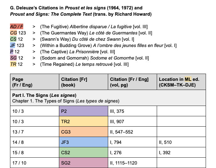 You’ll see I’ve also started finding the corresponding English passages in the 6-volume Moncrieff–Kilmartin–Enright translation (first published in 1992). I’ve also made note of a few errors, corrections, and deletions Howard or his editors made in their translation of Deleuze’s citations and footnotes.