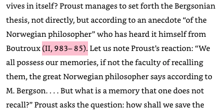 2). Missing Book Information. One of the major problems I have with the English translation, despite the correction above, is that it removes book information from Deleuze’s citations. For instance, on page 133 of the original text, Deleuze includes two references in a single footnote. Both references can be found in Vol. 1 of the 3-volume edition of A la recherche Deleuze uses. However, the two references come from two different books: the first from the second part of Du côté de chez Swann (CS2) and the second from the first part of A l’ombre des jeunes filles en fleurs (JF1). In the English translation, however, the citation merely reads, “I, 236, 533.” If the book information had been retained, at least the English reader would know that the citation refers to passages found in different books. (Note: these two passages appear, respectively, in the Moncrieff–Kilmartin–Enright edition on pages 335 [vol. 1: Swann’s Way] and 145 [vol. 2: Within a Budding Grove.])
