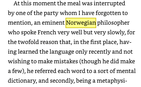 1). Correction. Page 74 of the original text mistakenly refers readers to pp. 883–885 from vol. 2 (of 3) of A la recherche: “SG2, II, 883–885” (second part of Sodom et gomorrah). Howard’s English translation corrects this mistake, referring readers on page 59 to “II, 983–85.” How do we know the latter is correct whereas the original is in error? Because Deleuze cites pages that refer to “an anecdote of ‘a Norwegian philosopher’” (59). Pp. 883–85 concern “la belle jeune fills à la cigarette” (SG2, II, 883) as well as news that Mme Verdurin had invited “le marquis et la marquise de Cambremer” to dinner (SG2, II, 884). If we’re looking for the anecdote of the philosopher, we need to wait another hundred pages or so. (Note: The anecdote appears in the Moncrieff–Kilmartin–Enright edition in vol. 4 (of 6), Sodom and Gomorrah, pp. 447–50. Or so. For the corresponding pages about “the handsome girl with the cigarette” and Mme Verdurin’s bold invitation, see pp. 381–84.)