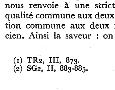 3). Error. On page 110 of Proust and Signs, readers are referred in a single citation to three passages in A la recherche: “I, 352; II, 249; III, 895–96.” However, when we look at the corresponding citation in the original French edition (page 133), we see something alarming: “CS2, I, 352; P2, III, 249; TR2, III, 895–896.” Do you see the problem? The English translation mistakenly refers us to vol. 2 (of 3) of A la recherche. If we had the correct edition of Proust, we would still end up in the wrong place (in Le côté de Guermantes instead of La prisonnière!). With the book information removed, English language readers of Proust and Signs have no way to find the correct passage without recourse to the original French edition of Proust et les signes.