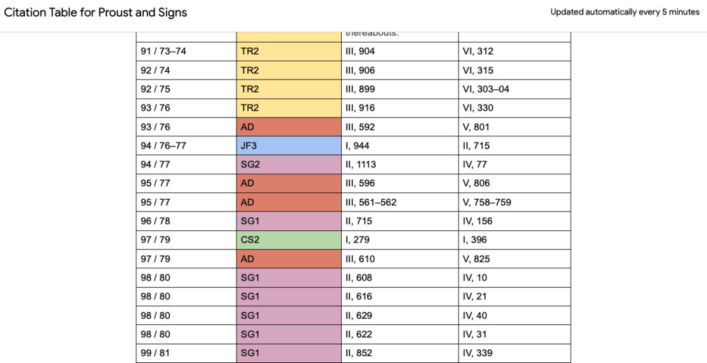 For the past week or so, I’ve been building a table that tracks the citations to Marcel Proust in Deleuze’s Proust et les signes. I reproduce the citation information to the 3-volume mid-century Gallimard edition of A la recherche and locate the corresponding passages in the 6-volume Modern Library edition of the Moncrieff–Kilmartin–Enright English translation of the Search.